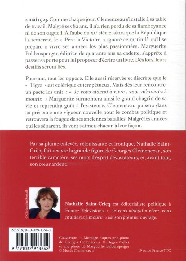 Mais dès leur rencontre, un pacte les unit : « Je vous aiderai à vivre , vous m’aiderez à mourir. » Marguerite surmontera ainsi le grand chagrin de sa vie et reprendra goût à l’existence. Clemenceau puisera dans sa présence une vigueur nouvelle pour le combat politique et retrouvera la fougue de ses anciennes batailles.. Lisez « “Je vous aiderai à vivre, vous m’aiderez à mourir” » de Nathalie Saint-Cricq disponible chez Rakuten Kobo. 2 mai 1923. Comme chaque jour, Clemenceau s’installe à sa table de travail. Malgré ses 82 ans, il n’a rien perdu de sa f.
